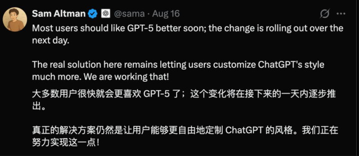 GPT-5发布后不到一周,在用户强大的反对声浪中,OpenAI不得不火速宣布GPT-4o等前代模型回归。