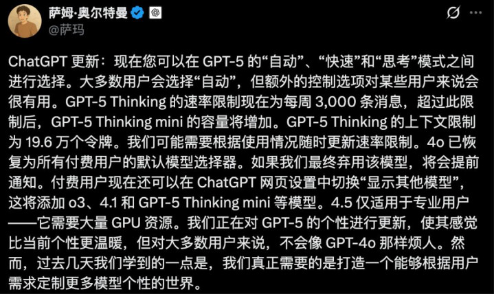 8月13日,Altman发布了ChatGPT的更新信息,已经将4o恢复为所有付费用户的默认模型,他们可以在网页设置中切换o3、4.1、GPT-5 Thinking mini等其他模型。