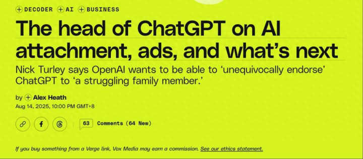 一周之后,Nick Turley在《The Verge》编辑Alex Heath的采访中,深度复盘了GPT-5发布后面临的用户差评风波,以及他的一些思考。